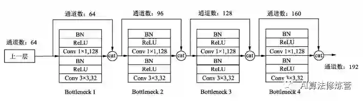 1、每一个Bottleneck输出的特征通道数是相同的,例如这里的32。同时可以看到,经过Concatnate操作后的通道数是按32的增长量增加的,因此这个32也被称为GrowthRate。