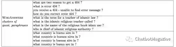 可以看出,扩增版的数据集,问题大多数都是自动构造的,缺乏多样性和真实性。怎么办呢?我们希望训练数据中问题的分布式表达尽量贴近它所类似的真实问题的分布式表达。因此,作者在WikiAnswers中抓取了2.2M问题(不含答案),通过问题的分类标签,将它们分为了350k个类簇(可以理解为每个类簇里的自然语言问题它所表达的意思是一样的)。如下表所示