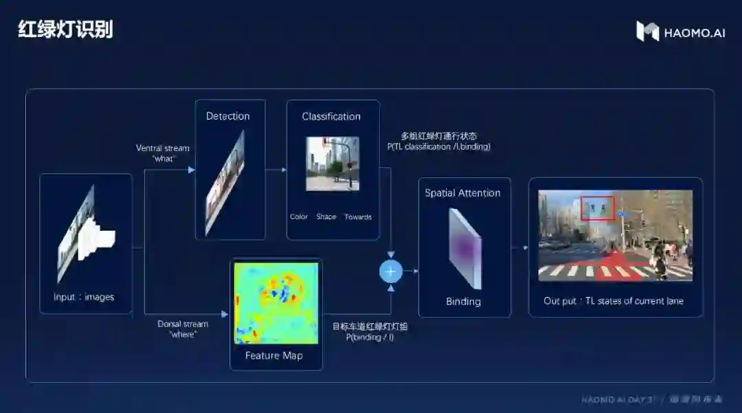 在不完全依赖高精地图的情况下,若想成功实现红绿灯识别,需要完成灯型和状态的检测,同时也要完成在视野中多组红绿灯中识别目标灯组的绑路操作。毫末智行设计了一个针对红绿灯检测及绑路的「双流」感知模型,将红绿灯检测和绑路问题分解成两个通道。