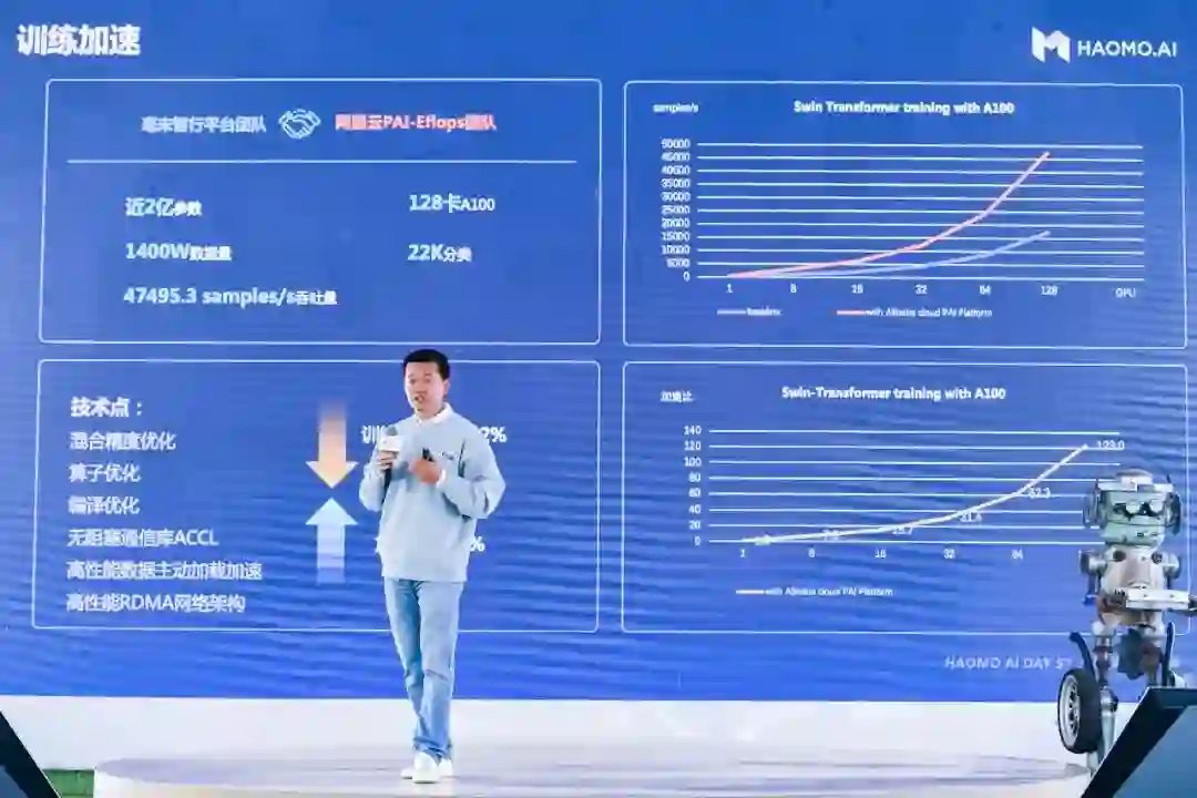 毫末智行还与阿里合作,基于 128 卡 A100 集群,实现了 Swin Transformer 模型分布式训练,探索了混合精度训练、算子和编译的优化,使大模型训练成本降低了 60%,加速比超过 96%。
