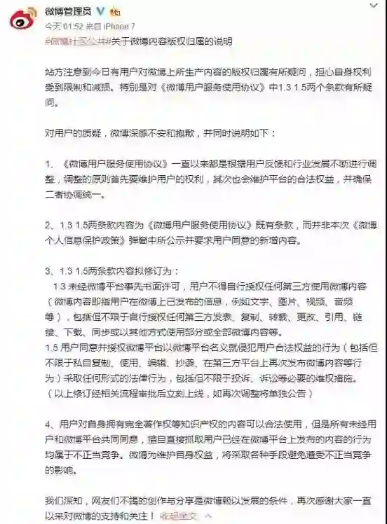 此后,新浪微博再次发布声明,称:微博上发布的原创内容,著作权理所应当属于内容创作者所有,微博作为发布平台只享有一定范围的使用权。用户对自己的原创内容,可以根据自己的意愿发布到其他平台上。
