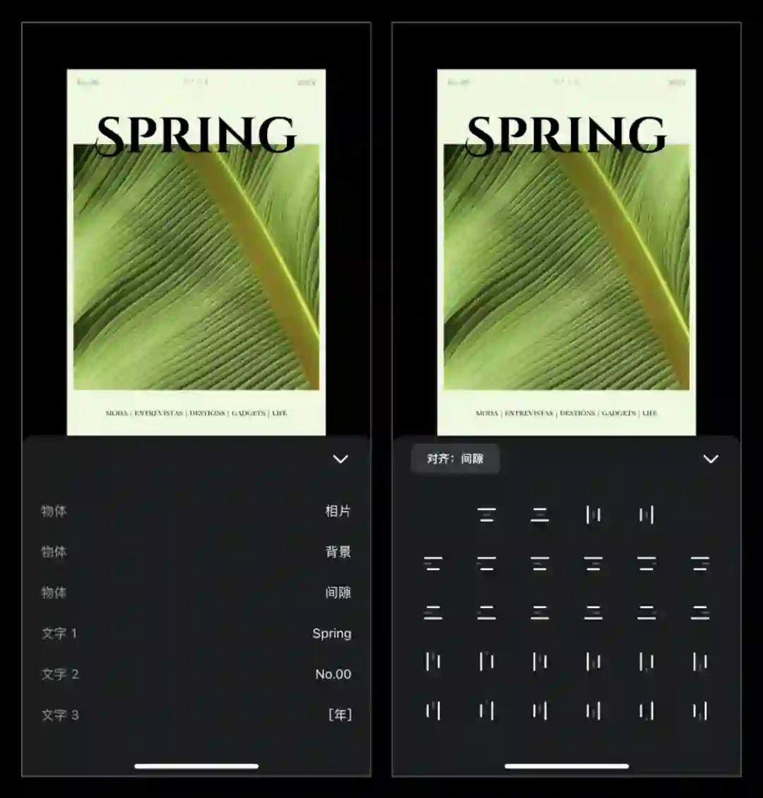 在创作室里,比较特别的是文字对齐功能。在这里,文字的布局没有采用简单的拖拽方案来完成,而是设计了一个相对复杂的对齐方案,用户可以选择各种情况的对齐对象与方法,随后再设计间距等参数。