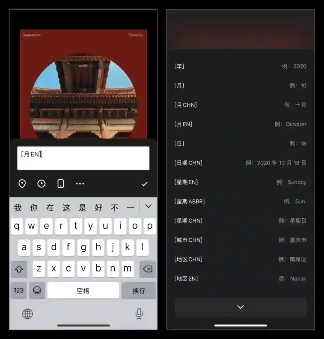 在介绍信息分类卡片时,我有提到一个叫「文字替换」的功能。这个功能的设计初衷也是为了更轻松快速地生成卡片。当前预设的文字替换覆盖了相片相关的常用文字内容,在后续,卡片馆还会上线自定义文字替换功能。