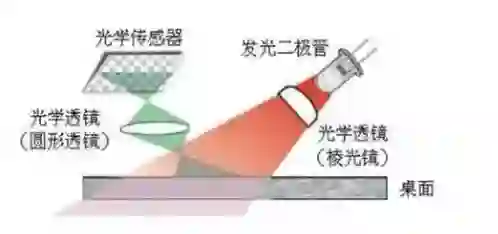 通过发光二极管和光电二极管来检测鼠标对于一个表面的相对运动,它不像机械鼠标一样通过鼠标球的旋转驱动两个互相垂直的轴的转动来获得鼠标移动的位置。