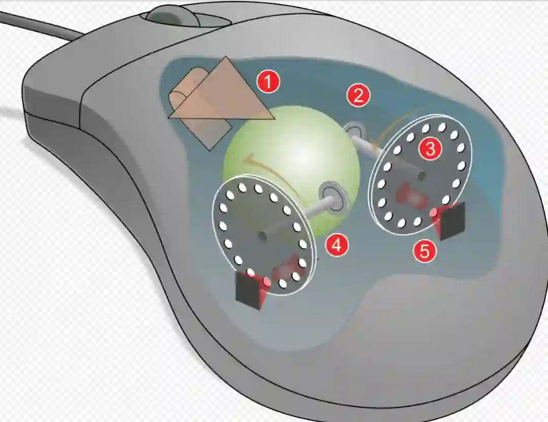 光电机械鼠标工作原理 1:移动鼠标带动滚球。2:X方向和Y方转杆传递鼠标移动。3:旋转编码器的光电刻度盘。4:晶体管发射红外线可穿过刻度盘的小孔。5:光电传感器接收红外线并转换为平面移动速度。