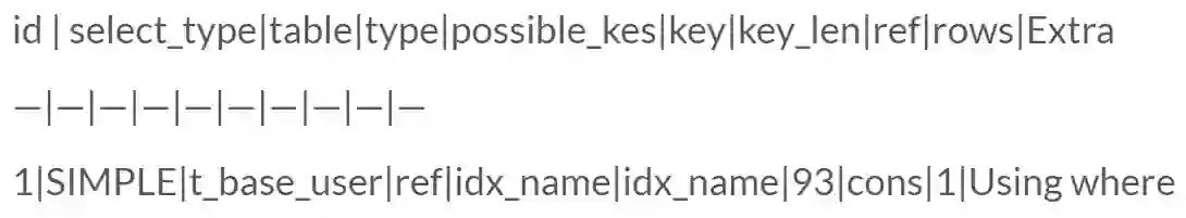 上面这个执行计划给到的信息是: 这个结果通过一个简单的语句全表扫描,共扫描1行,使用where条件在t_base_user表中筛选出的。发现该语句并没有走索引,为什么是这样的呢?别急,我们紧接着看下一节。