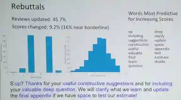 对于有志于向ICML投稿的读者,我建议大家关注大会的反驳环节(rebuttal)。本次ICML的反驳环节促成了45%的审稿意见变更,最有利于提升审稿分数的关键词包括“深度”、“包括”、“澄清”、“建议”、“更新”、“有建设性的”、“有用的”、“有价值的”、“感谢”等等。如果把这些词连起来会变成如下的一句话:感谢您有用的建设性建议以及无价的有深度的问题。如果我们有测试我们估计结果的空间,我们会澄清我们的观测,并且更新最终的附录。这当然只是一个玩笑,但从中可以看出,我们在向审稿人提出反驳意见的时候一定要保持礼貌和理性。
