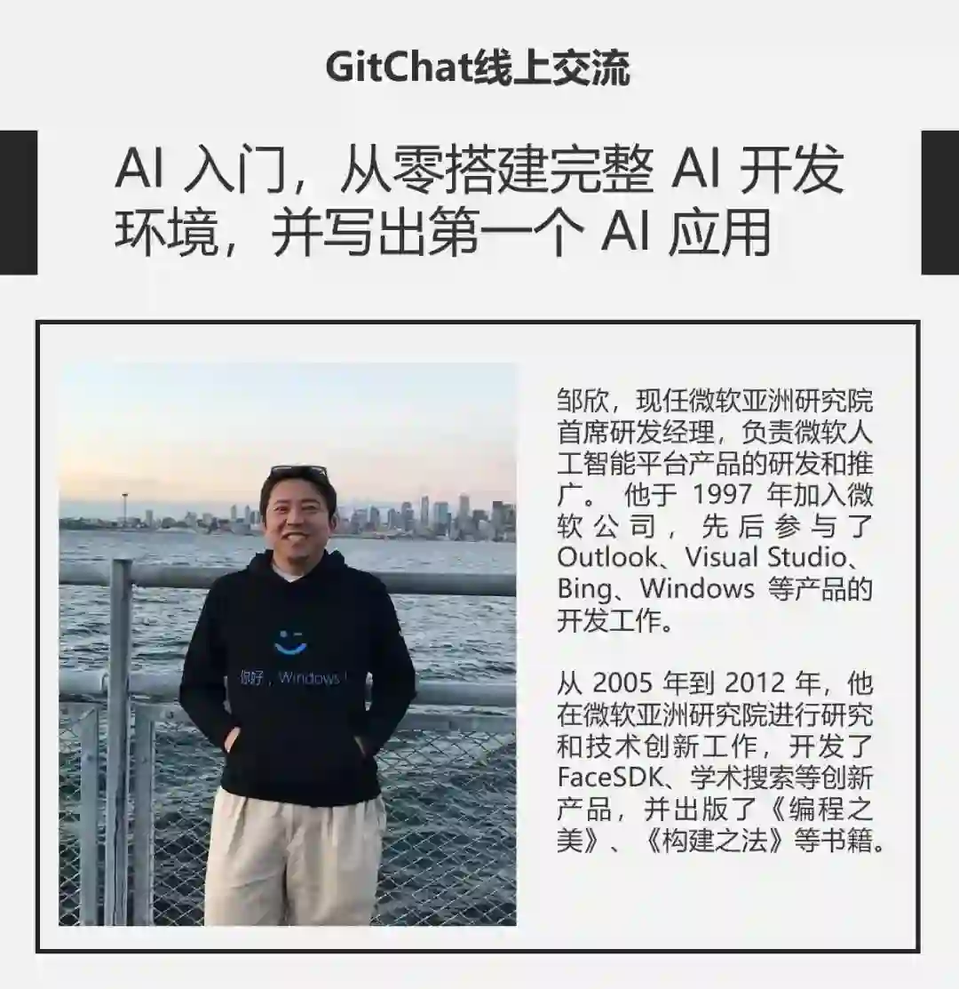 想从零开始入门AI?快来报名参加《编程之美》作者、微软亚洲研究院首席研发经理邹欣在GitChat发起的线上交流活动,教你从零开始搭建完整的 AI 开发环境,训练AI模型,并写出第一个 AI 应用。
