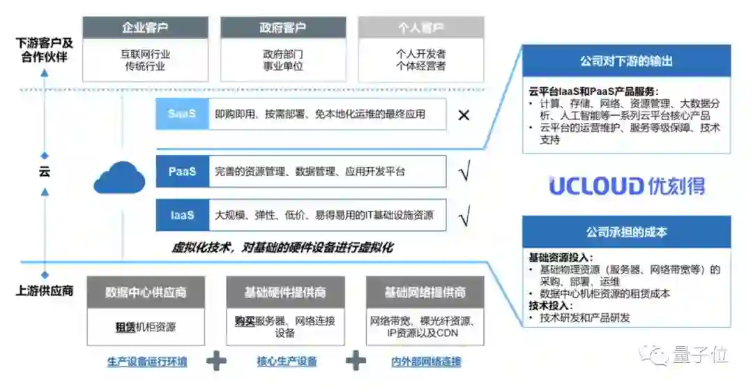 主要的业务模式是公司采购基础资源,然后对基础的硬件设备进行虚拟化,打包成IaaS、PaaS产品服务对企业客户、政府客户以及个人客户输出。