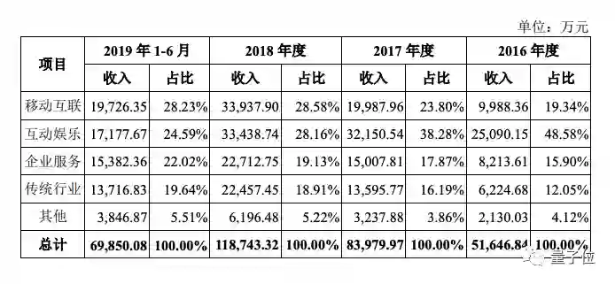 客户相对集中,主要来自于互联网领域,其中移动互联、互动娱乐行业占比52.82%,其次是企业服务,占比22%;传统行业占比19.64%,虽然与往年有所提升但非常微弱。
