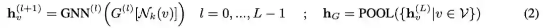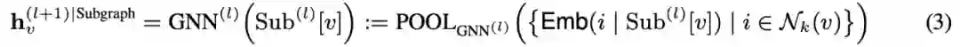 通过 GNN 计算结点 v 的 subgraph 中各节点 i 的 embedding,通过 POOL 函数得出整个子图的表示作为结点 v 的表示,成为 subgraph encoding。