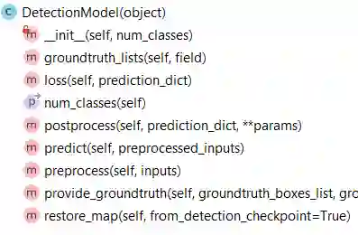 DetectionModel 类结构如下所示,其中 groundtruth_lists 主要包含模型中 groundtruth boxes 的相关信息,loss 用于计算模型 loss 值,num_classes 为要检测的类别数目,postprocess,preprocess 和 predict 如上所述。restore_map 主要用于模型的 fine tuning。