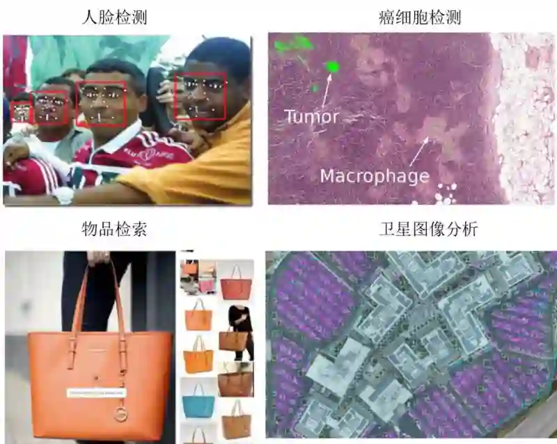 目前,在工业界已经有很多使用目标检测技术的实际应用,如面部检测;数目识别,如统计人、车、花、微生物的数量;医疗领域中癌细胞识别;图像搜索中检索图像中不同位置的物体;卫星图像分析中统计卫星图中的车,树和轮船等物体。相关用例场景如下图所示: