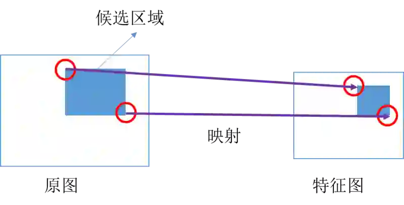 ROI 映射是把原图的左上角和右下角的候选区域映射到特征图上的两个对应点,这个可基于图像的缩放比例(视野范围变化)进行映射,如下图所示: