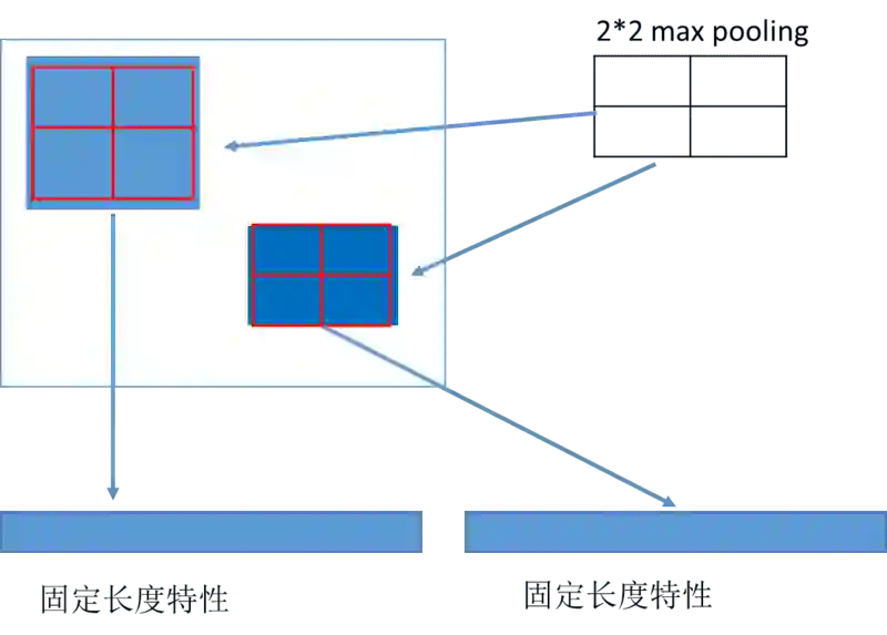 由于 ROI 映射出来的特征区域大小是不同的,而神经网络要求对类别预测特征和 box 位置回归特征的大小是固定的。这时候需要用 ROI Pooling 把大小不同的候选区域特征映射到固定大小的特征区域。ROI Pooling 的具体实现可以看做是针对 ROI 区域特征图的 Pooling,只不过因为不是固定尺寸的输入,因此每次的 pooling 网格大小需要计算,如下图所示: