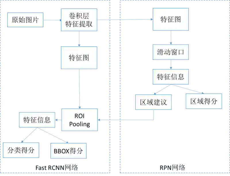 Faster RCNN 为由区域生成网络(Region Proposal Networks, RPN)加 Fast RCNN 组成的系统,属于基于候选区域生成的目标检测网络,网络的宏观架构如下图所示: