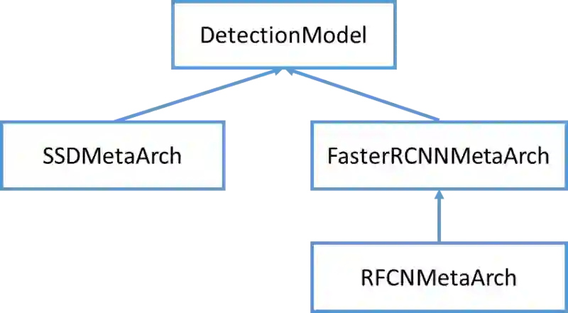 目标检测模型类继承关系如下图所示,其中 RFCN 的模型类似于 Faster RCNN,所以继承自 FasterRCNNMetaArch,主要区别在于模型的第二阶段与 Faster RCNN 模型不同。