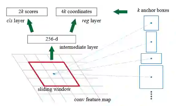 主要思想为:在卷积特征图上,用 3×3 的窗口执行滑动操作。对每个滑动窗口的中心点,选取 k 个不同 scale、aspect ratio 的 anchor。基于 3×3 的滑动窗口大小,scale 和 aspect ratio 映射回原图,生成候选的 region proposals。每个滑动窗口操作同时会生成对应窗口区域的特征编码(源论文中是对应 256 维的低维特征编码)。对该低维的特征编码做两次卷积操作,输出 2×k 分类特征和 4×k 回归特征,分别对应每个点每个 anchor 属于目标的概率以及它所对应的物体的坐标信息。