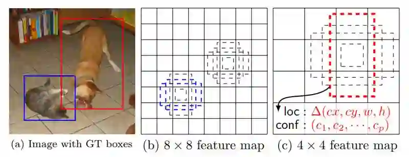 SSD 的基本思想是基于 CNN 网络,产生固定大小的 bounding boxes 位置偏移,以及每一个 box 中包含物体的概率得分后,使用非极大值抑制(Non-maximum suppression)方法得到最终的检测结果。下面主要介绍下 SSD 算法中 default boxes 生成算法,该算法中 default boxes 不必要与每个层的 receptive fields 对应。特征图中的每个网格位置,来负责原始图像中特定的区域,以及物体特定的尺寸,如下图所示: