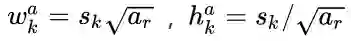 而每个默认框长宽比根据比例值计算,原论文中比例值为{1,2,3,1/2,1/3},因此,每个默认框的长宽由如下公式计算得到: