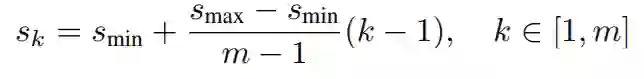 假设使用 m 个不同层的特征图来做预测,最浅层特征图的 scale 值为 scale_min=0.2,最深层特征图的 scale_max=0.9。则每个特征图上 default box 的缩放比例可以由下面公式计算得到: