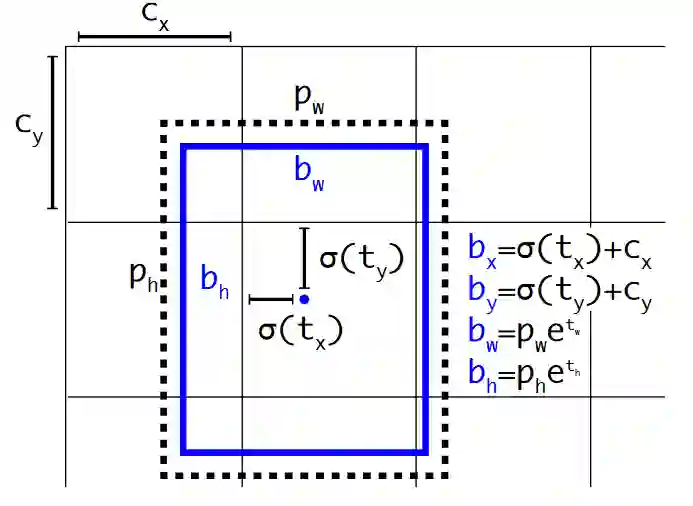 Location Prediction:直接使用 anchor boxes 时,在早期迭代的时,模型不稳定,主要原因是 boxes 的 offset 没有限定,可能会出现 anchor 检测很远的目标 box 的情况,效率比较低。而现实场景中应该是每一个 anchor 负责检测周围附近单位以内的目标 box,如下图所示。其中,每一个 bounding box 预测 4 个坐值,分别为 tx,ty,tw,th。如果这个 cell 距离 bounding box 坐标系统左上角的边距为(cx, cy)以及对应的 bounding box 的长和宽分别为 (pw, ph)。可按照上述公式计算出 bounding box 的坐标值(bx, by, bw, bh),如下图所示: