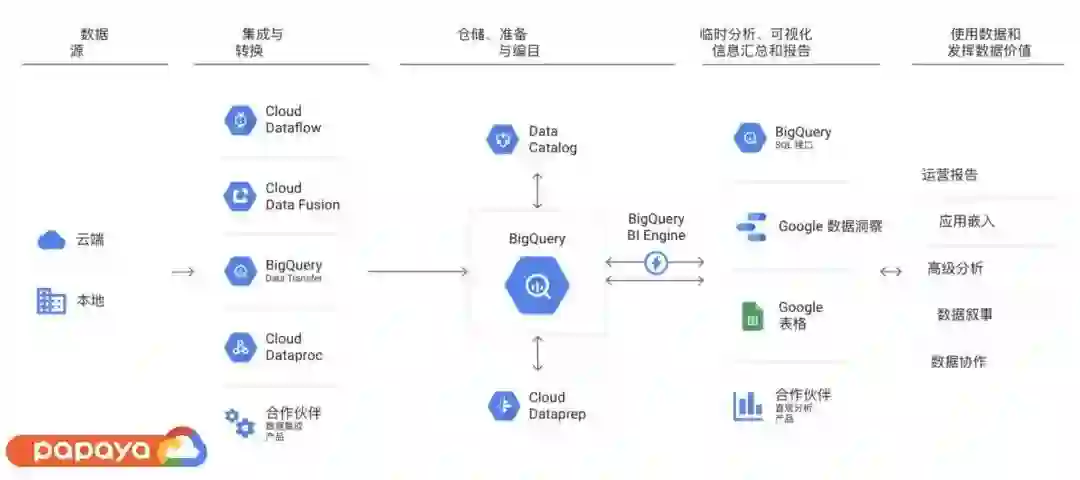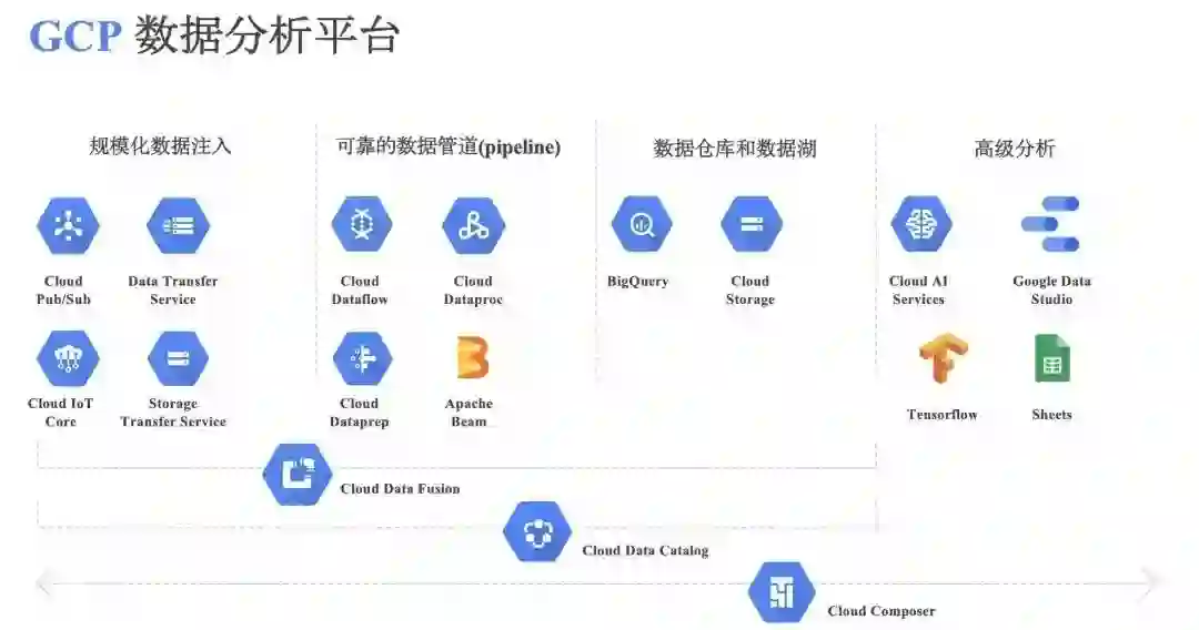 Google 在大数据领域成果颇丰,开放在 GCP 数据分析平台上,为企业提供完整数据生命周期的管理,包括规模化数据注入、数据迁移过程中的处理、数据计算和存储、到最后的高级分析预测、数据展示等。