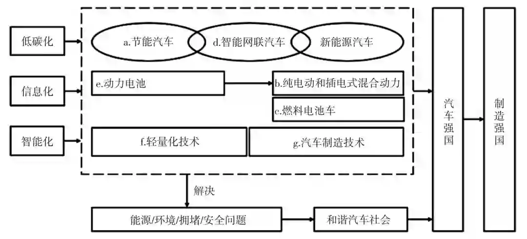 未来,以节能汽车、新能源汽车和智能网联汽车为产品方向和集成载体,汽车技术向低碳化、信息化和智能化发展的趋势将日趋明显 [17~21],而随着汽车技术的不断进步,最终期待在社会和产业两个维度实现发展愿景。
