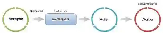 Acceptor接收socket后,不是直接使用Worker中的线程处理请求,而是先将请求发送给了Poller,而Poller是实现NIO的关键。Acceptor向Poller发送请求通过队列实现,使用了典型的生产者-消费者模式。在Poller中,维护了一个Selector对象;当Poller从队列中取出socket后,注册到该Selector中;然后通过遍历Selector,找出其中可读的socket,并使用Worker中的线程处理相应请求。与BIO类似,Worker也可以被自定义的线程池代替。