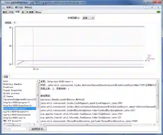 现成的工具,如JDK自带的jconsole工具可以方便的查看线程信息(此外还可以查看CPU、内存、类、JVM基本信息等),Tomcat自带的manager,收费工具New Relic等。下图是jconsole查看线程信息的界面: