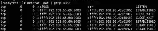 可以看出,有一个连接处于listen状态,监听请求;除此之外,还有4个已经建立的连接(ESTABLISHED)和2个等待关闭的连接(CLOSE_WAIT)。