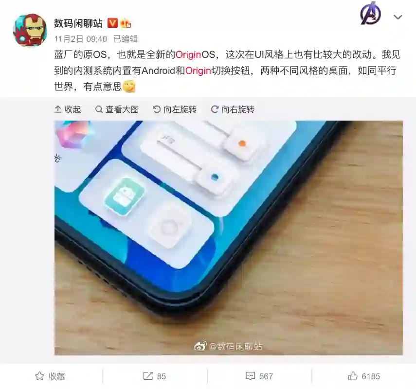 博主也称,这款 vivo 的新系统,在 UI 上会有比较明显的改动,内测系统中可以在 Android 和 Origin 之间切换。