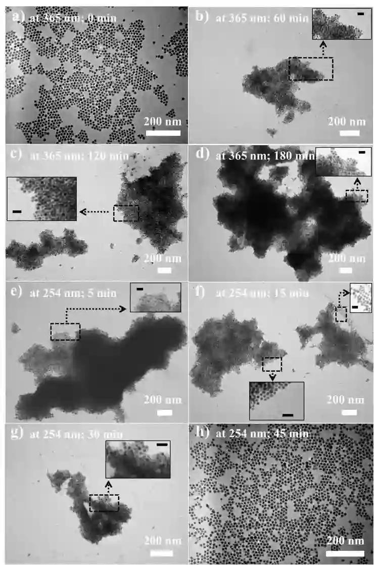 Lin 表示:“一旦来自邻近金纳米颗粒的聚合物链开始了光交联,它们会通过自组装工艺使得纳米颗粒聚集到一起,从而生成大型纳米颗粒组合。这项工艺是完全可逆的,并且可以重复许多次。”