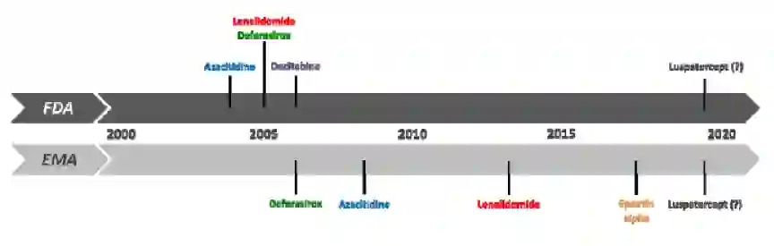 贫血是MDS最常见的症状,定期输注红细胞(RBC)可致铁过载。ESA[重组促红细胞生成素 (EPO)或达贝泊汀(DAR)]是贫血的标准治疗,近期EPO-alfa在欧盟获批,其治疗反应率高于DAR。