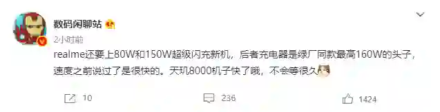 据 @数码闲聊站 爆料,realme 将要上 80W 和 150W 超级闪充新机,后者充电器是OPPO 系同款最高 160W 充电头,这将是目前市场上快充功率最高的手机。目前市面上的高端旗舰最高支持 120W 超级闪充,15 分钟可以充满 4500mAh 电池。即将发布的红魔 7 Pro 支持 135W 超级闪充,15 分钟可以充满 5000mAh 大电池。相较于安卓阵营,苹果 iPhone 这几年在快充方面的进步并不明显,最新的 iPhone 13 系列不过才支持 29W 快充。另外,这几年的三星旗舰最高也仅支持 45W 快充。
