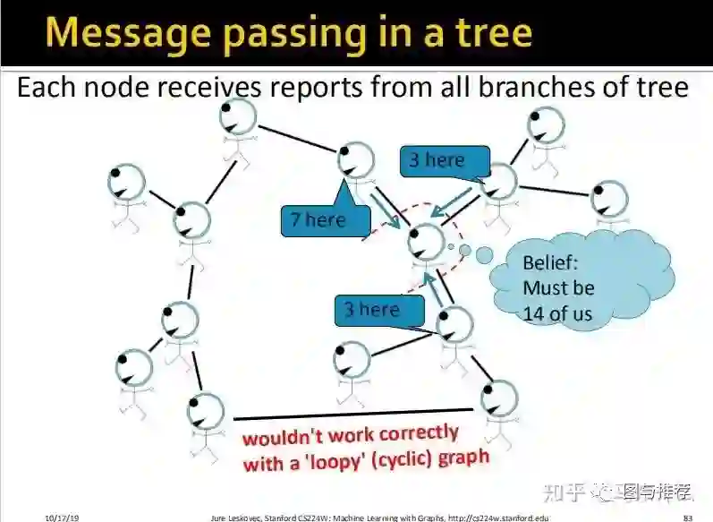 然而,普通的 belief propagation 无法处理存在cyclic(循环)的情况,这也很好理解,比如上图我们在两个节点之间又加入一条连线,这个时候就没法计算全部节点的数量了。