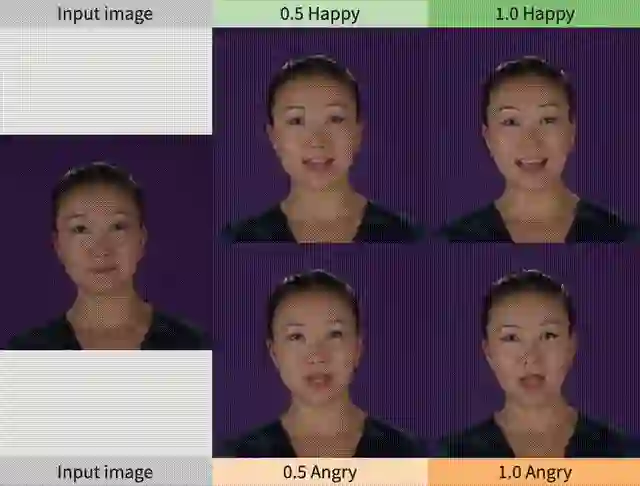 此外,可以使用情绪标签调制潜在关键点,以改变表情强度或控制注视方向。