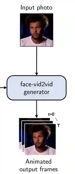 给定输入图像和上一步中预测的每帧潜在关键点,face-vid2vid生成器(一种基于图像的预训练面部动画模型)输出 512×512像素帧的动画视频。