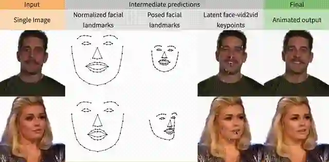 首先,它允许对输出面部表情(比如眨眼或特殊的头部姿势)进行细粒度控制。例如,可以修改面部特征点,以引入眨眼或其他头部姿势,来输入特定的姿势或预测姿势。