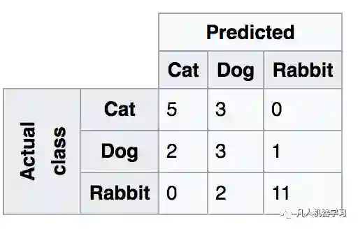在上图中,对于某一类别(比如猫)而言,错误会分为被误判成狗或误判成兔子两种情形,共记9种不同的类别,其中三类(对角线上的元素)是分类正确的。显然,仅仅用TP/TN/FP/FN这四类已经不足以分析这样的问题了。