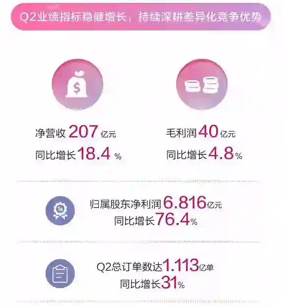 8月14日,唯品会发布了2018年二季度财报。财报数据显示,净营收同比增长18.4%至207亿元,归属股东净利润为6.816亿元,同比增长76.4%,这是唯品会连续实现23个季度连续盈利,另外,订单数为1.113亿,同比增长高达31%。