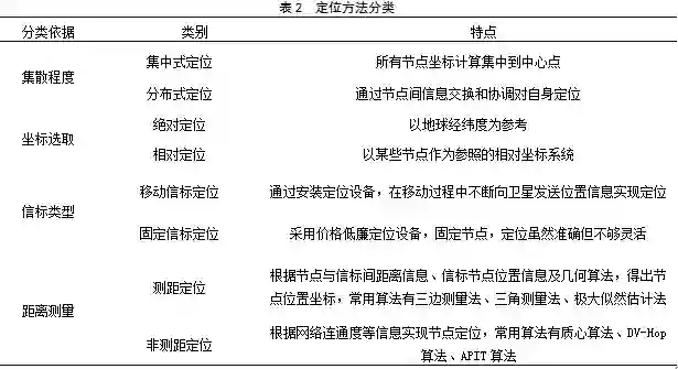 在无线传感器网络中,根据不同的分类指标可以将定位方法分为不同种类型[14],具体分类结果如表2所示。
