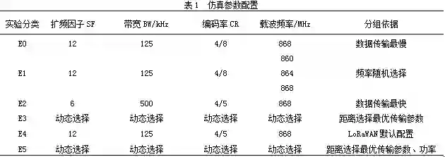 本文是对单一基站覆盖的无线网络进行仿真,仿真模拟类型分6组:数据传输最慢、频率随机选择、数据传输最快、距离选择最优传输参数、LoRaWAN默认配置及距离选择最优传输参数及功率。具体配置参数如表1所示。