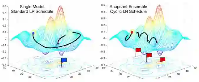快照集合(Huang et al., 2017)是一个最近提出的非常巧的方法,它使用热启动组装成一个整体,当训练单模型时不用额外的代价。这种方法可以训练一个单模型,按照我们之前看到的余弦衰减时间表收敛,然后保存模型参数,并进行热重启,重复这一个步骤M次。最后,所有保存的模型快照形成一个集合。从图2可以看到常用的随机梯度下降优化过程的错误曲面与快照集合过程的对比。