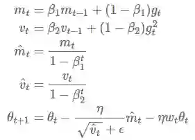 其中是学习率,第二个方程中的第三项是解耦权重衰减。同样,对于带权重衰减的Adam算法(AdamW),我们得到: