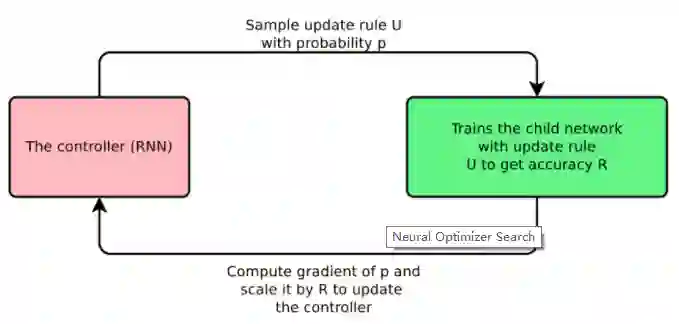 Bello等人定义了一种特定领域的语言,包含了对优化有用的原语,比如这些指数滑动平均值。然后,他们通过在所有可能的更新规则空间中采样,形成更新规则,使用这些规则训练模型,基于训练模型在测试集中的表现更新循环神经网络控制器。完整的流程见图3