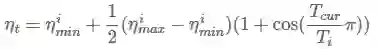 正如我们之前看到的,由于权重衰减不正常,热启动最开始对Adam算法并不适用。在固定权重衰减后,Loshchilov and Hutter (2017) 同样的把热启动扩展到Adam。他们设置参数为,得到下式: