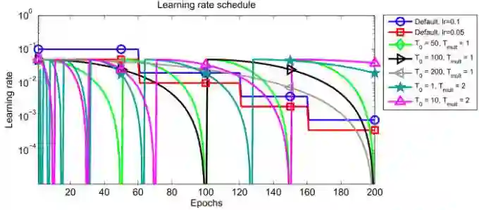 另外一个最近提出的有效方法是SGDR ((Loshchilov and Hutter, 2017) [6]),是随机梯度下降算法的改进,使用了热重启技术取代学习率衰减。每次重启时,学习率初始化为一些值,然后逐渐减少。更重要的是,这机制是热重启,因为优化不是从头开始的,而是从模型在上一步收敛的参数开始的。关键的因素是学习率的衰减是基于陡峭的余弦衰减过程,这将很快的降低学习率,如下所示: