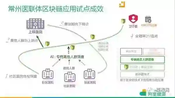 8月17日,阿里健康宣布与常州市合作医联体+区块链试点项目,将最前沿的区块链科技,应用于常州市医联体底层技术架构体系中,并已实现当地部分医疗机构之间安全、可控的数据互联互通,用低成本、高安全的方式,解决长期困扰医疗机构的“信息孤岛”和数据安全问题。