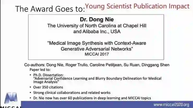 随后,MICCAI持久影响力奖等多个学术成就奖也相继颁发,其中沈定刚的博士生聂栋今年荣获Young Scientist Publication Impact Award。